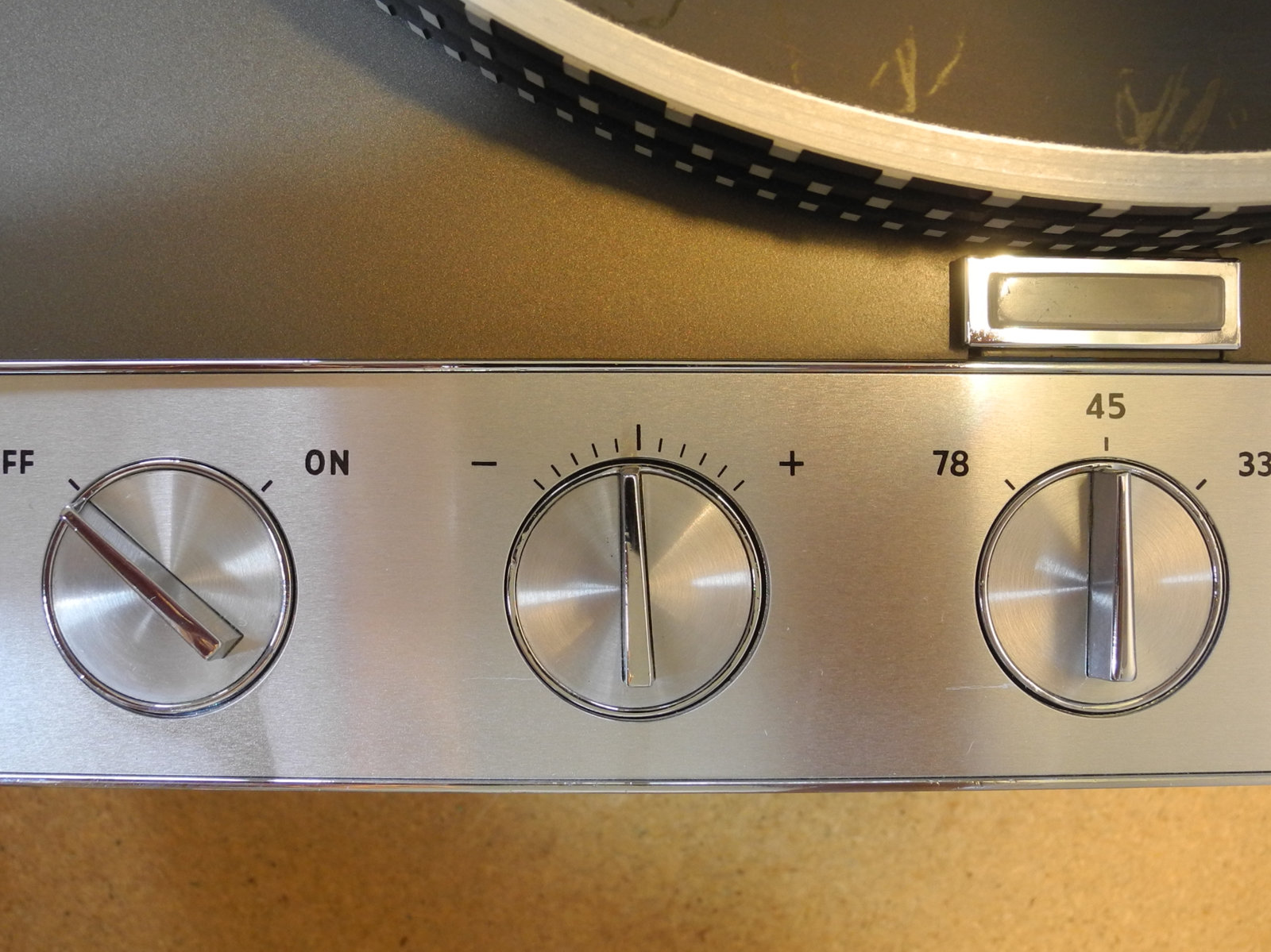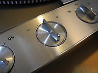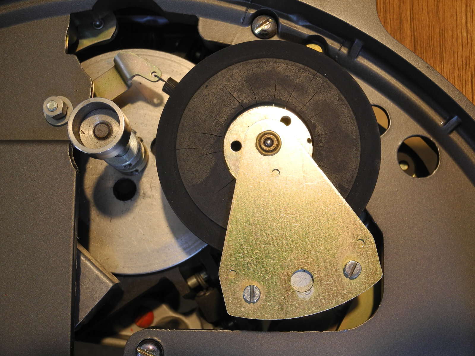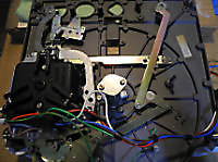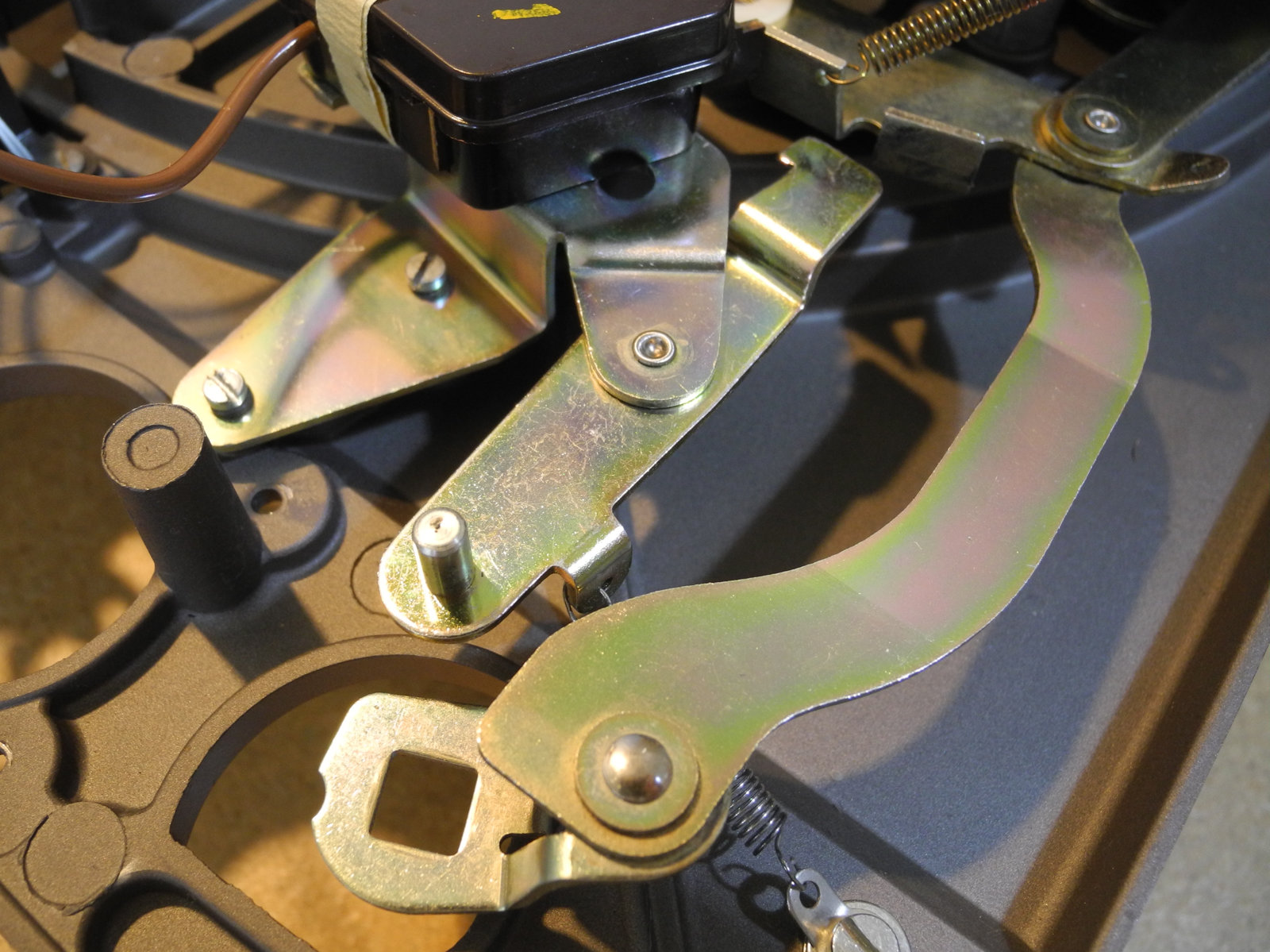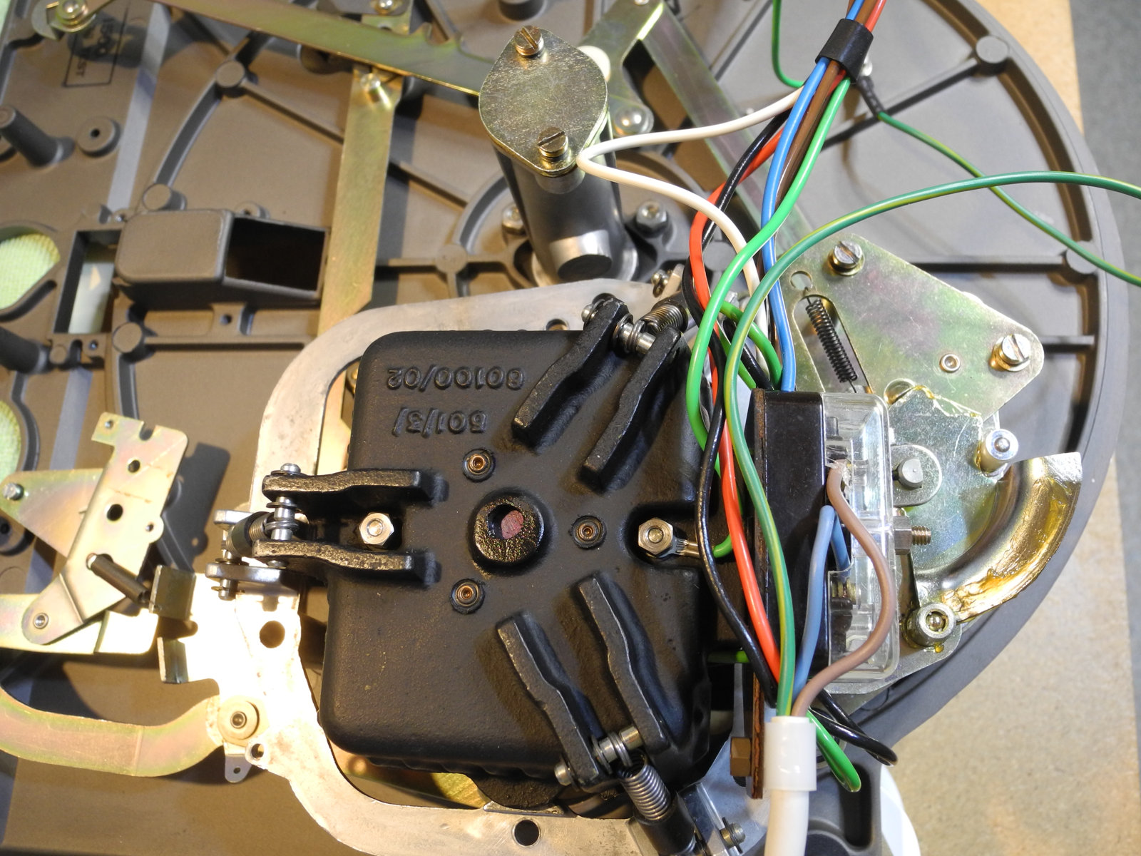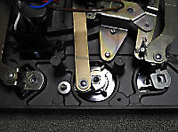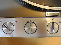 There are three systems of levers that connect the three front panel knobs to the speed change mechanism, the fine speed adjustment system (which uses a movable magnet to create eddy current drag in an aluminium disc), and the start/stop switching and interlocks.