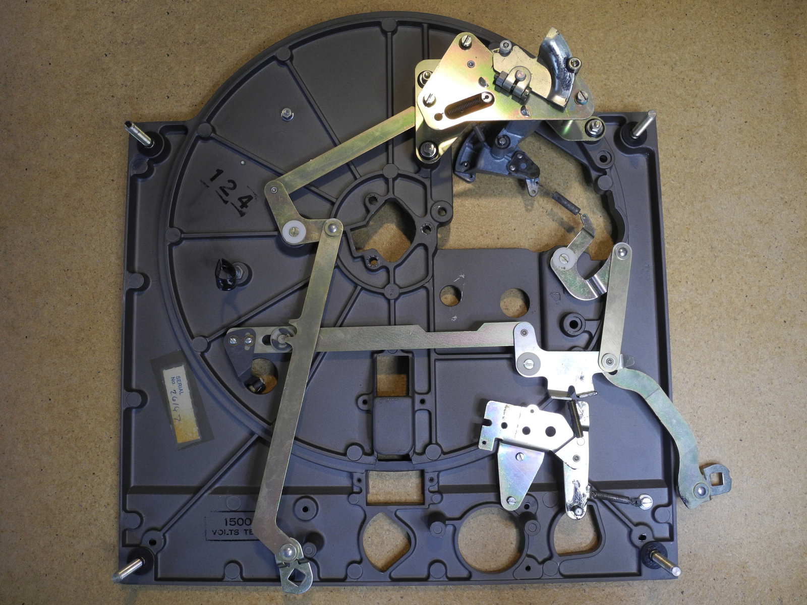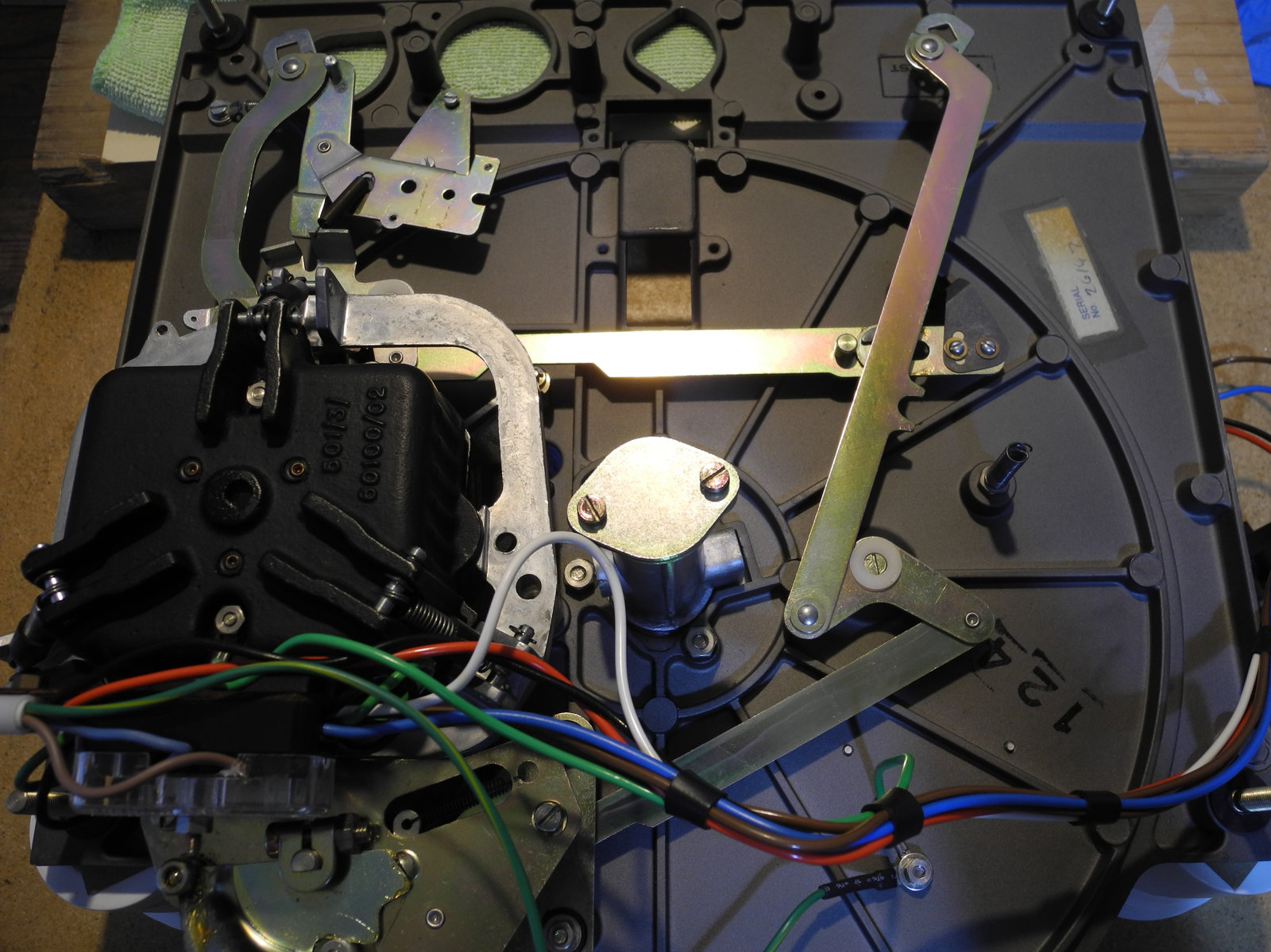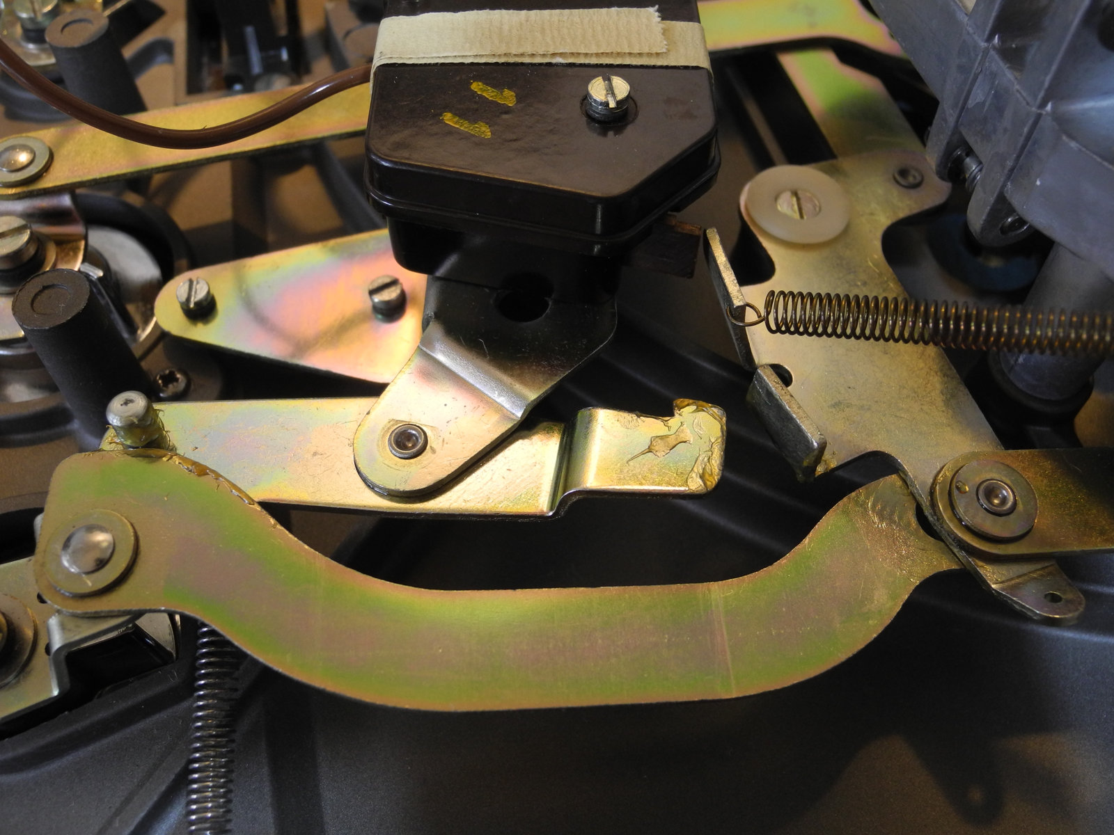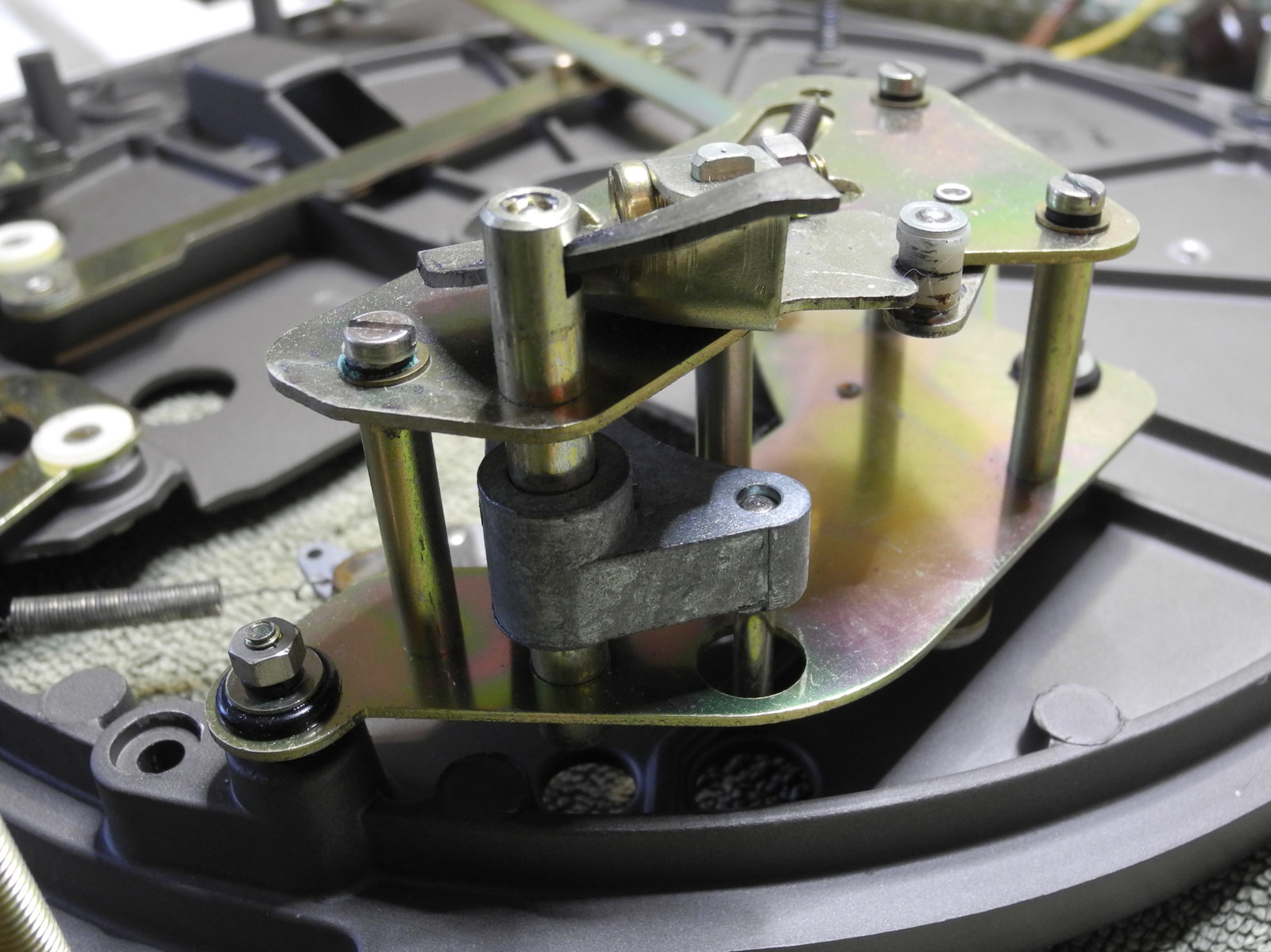 There are three systems of levers that connect the three front panel knobs to the speed change mechanism, the fine speed adjustment system (which uses a movable magnet to create eddy current drag in an aluminium disc), and the start/stop switching and interlocks.