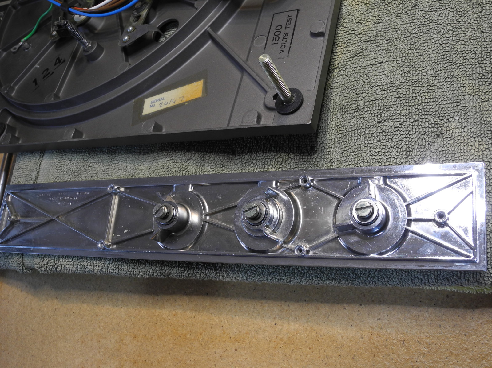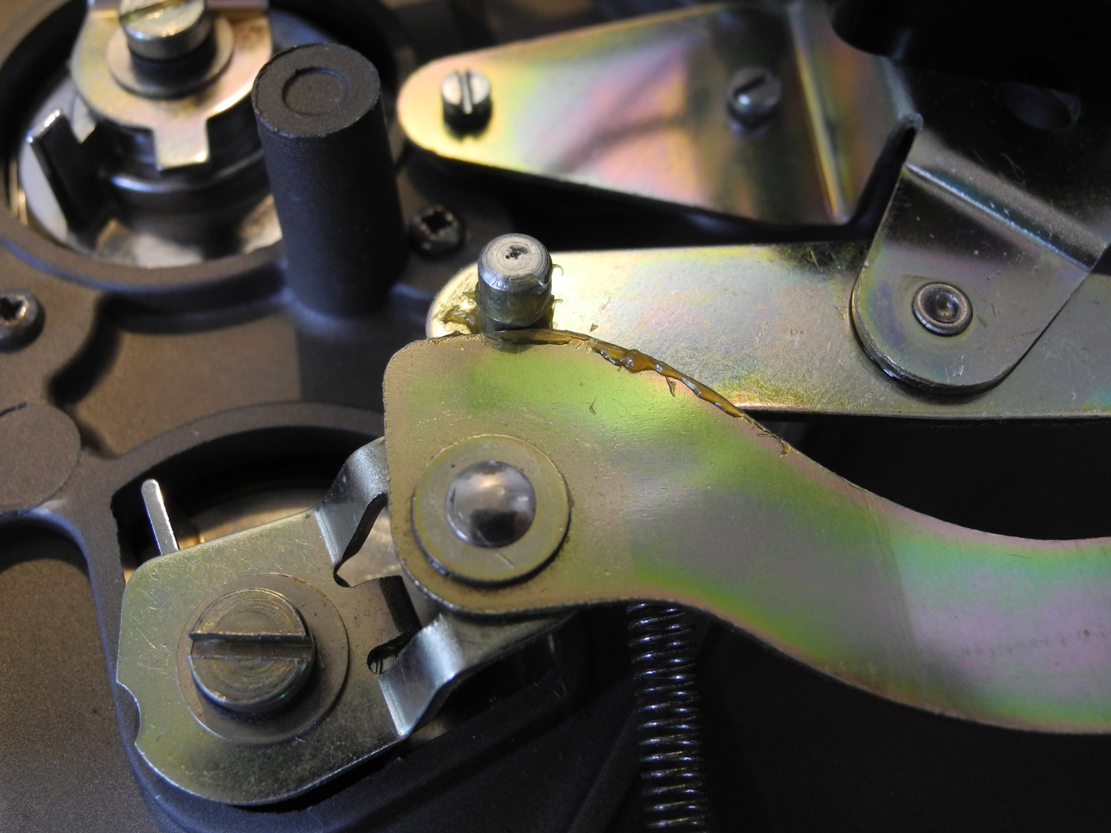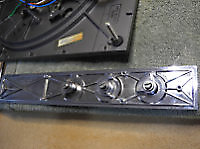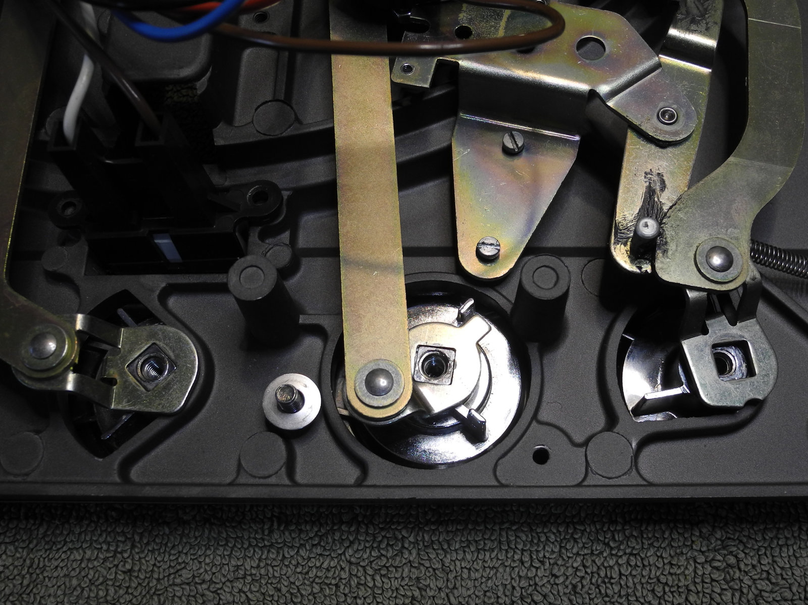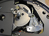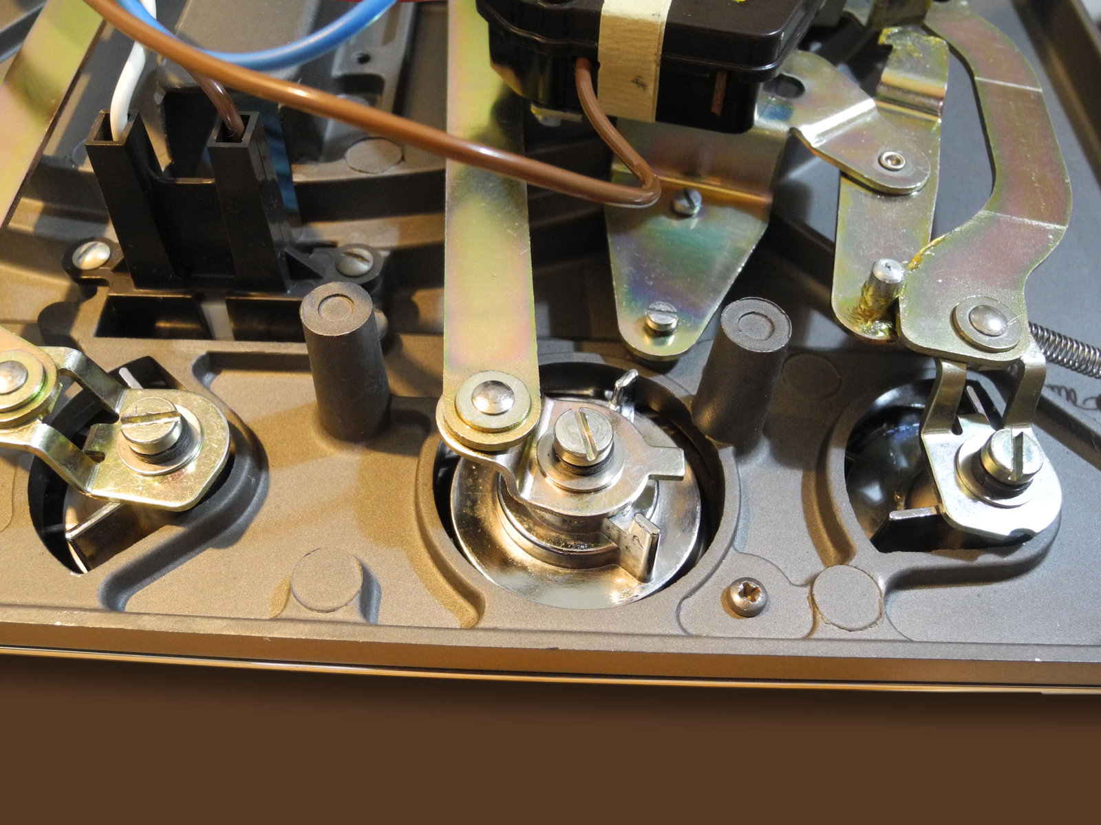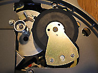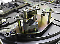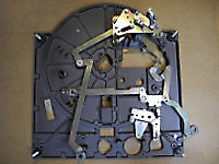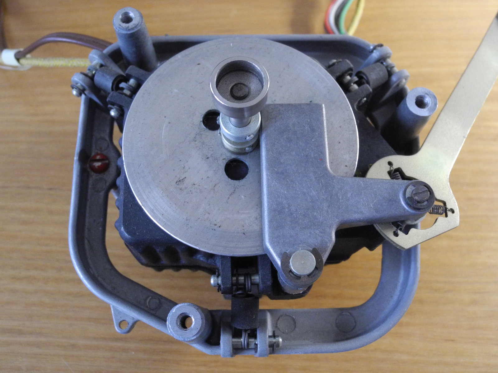 There are three systems of levers that connect the three front panel knobs to the speed change mechanism, the fine speed adjustment system (which uses a movable magnet to create eddy current drag in an aluminium disc), and the start/stop switching and interlocks.