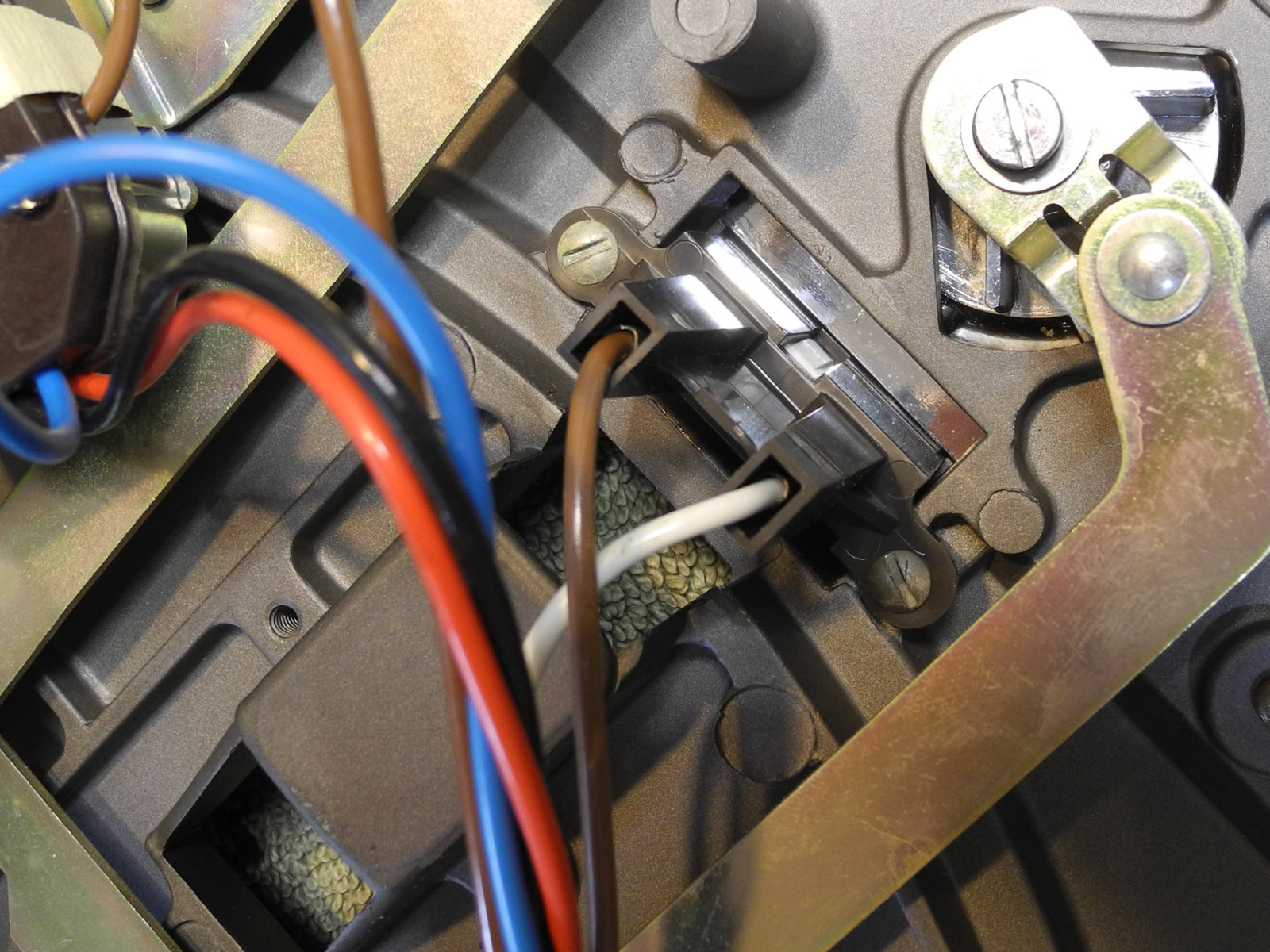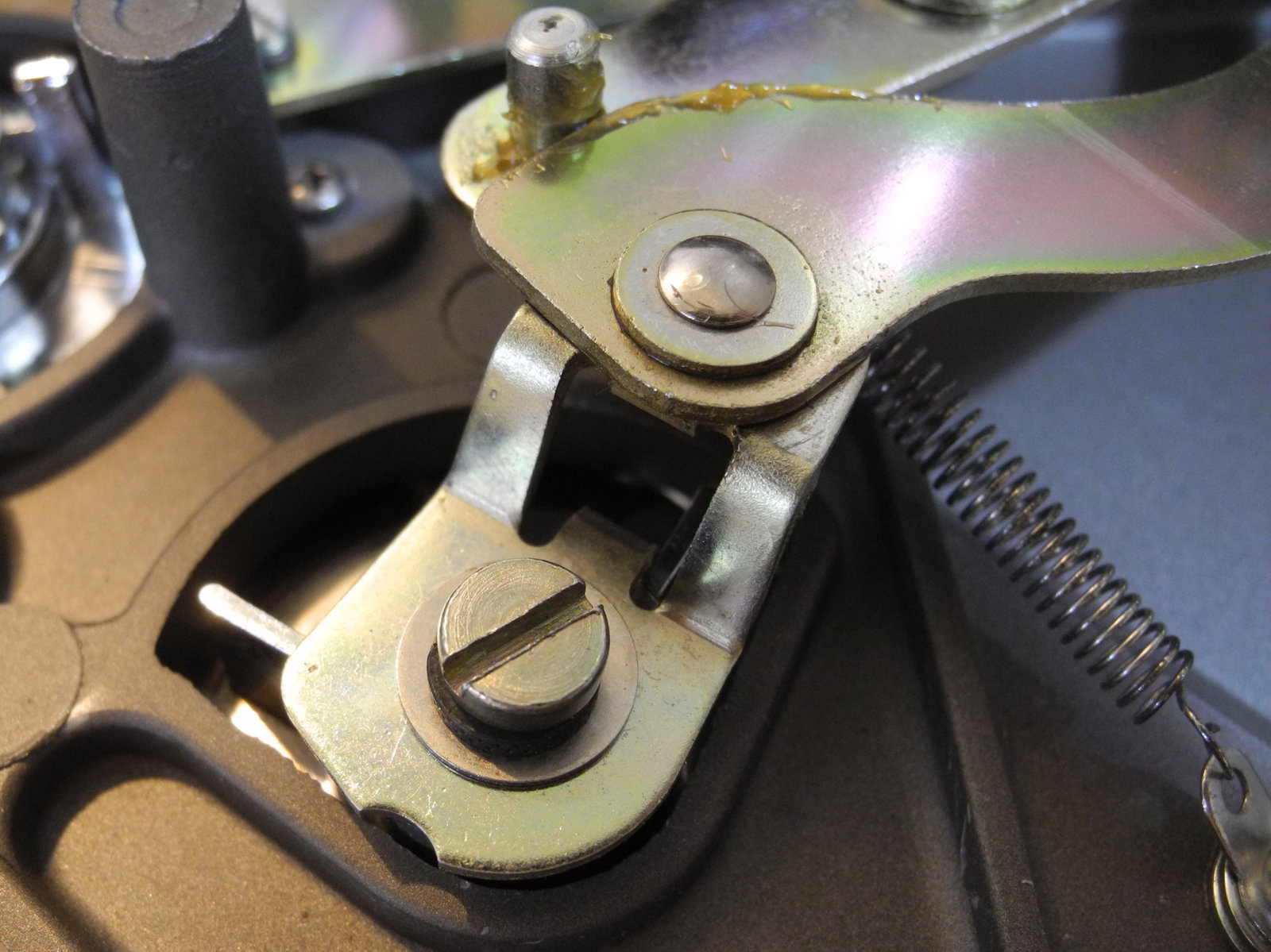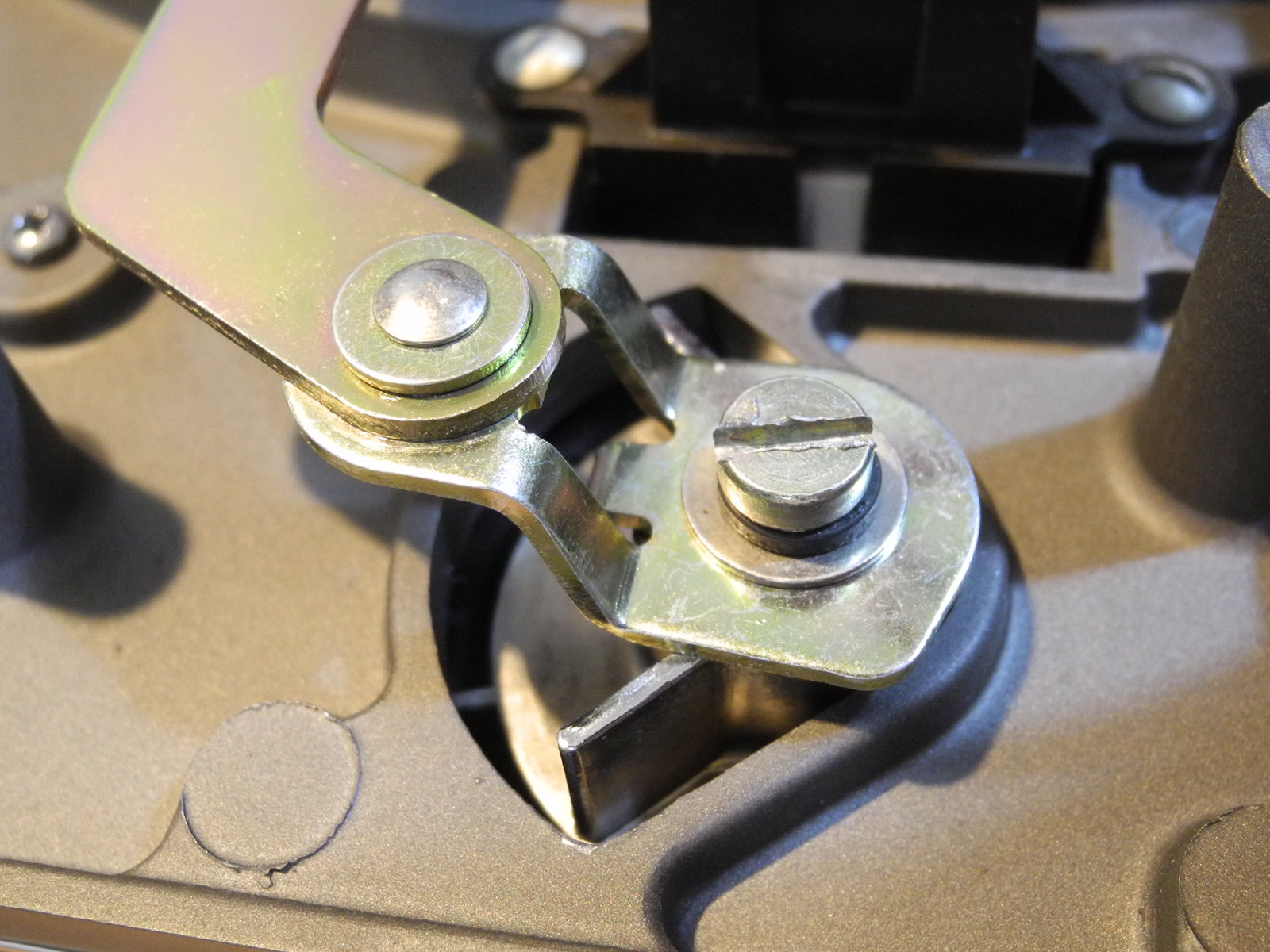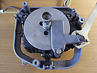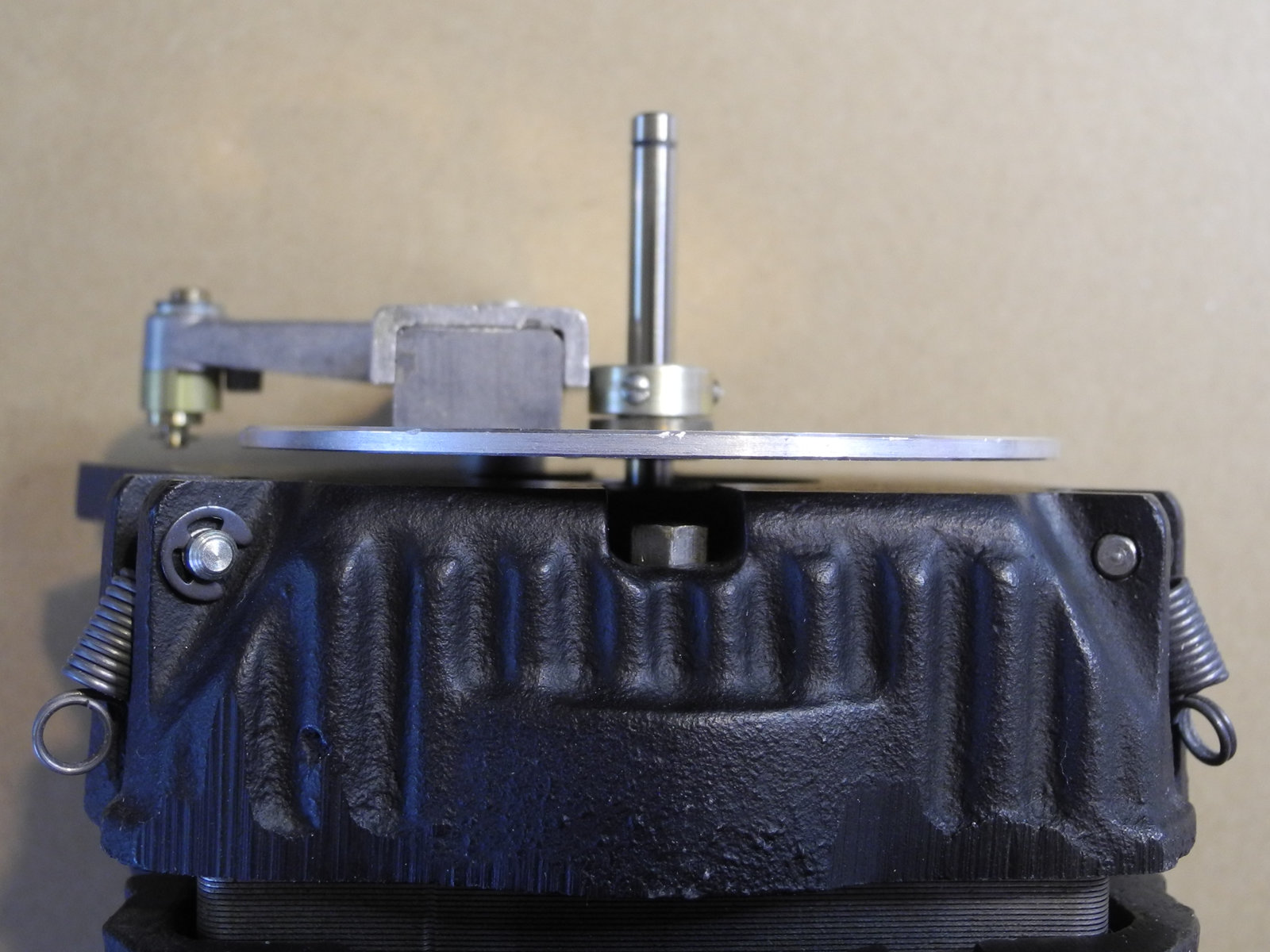 There are three systems of levers that connect the three front panel knobs to the speed change mechanism, the fine speed adjustment system (which uses a movable magnet to create eddy current drag in an aluminium disc), and the start/stop switching and interlocks.