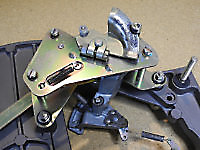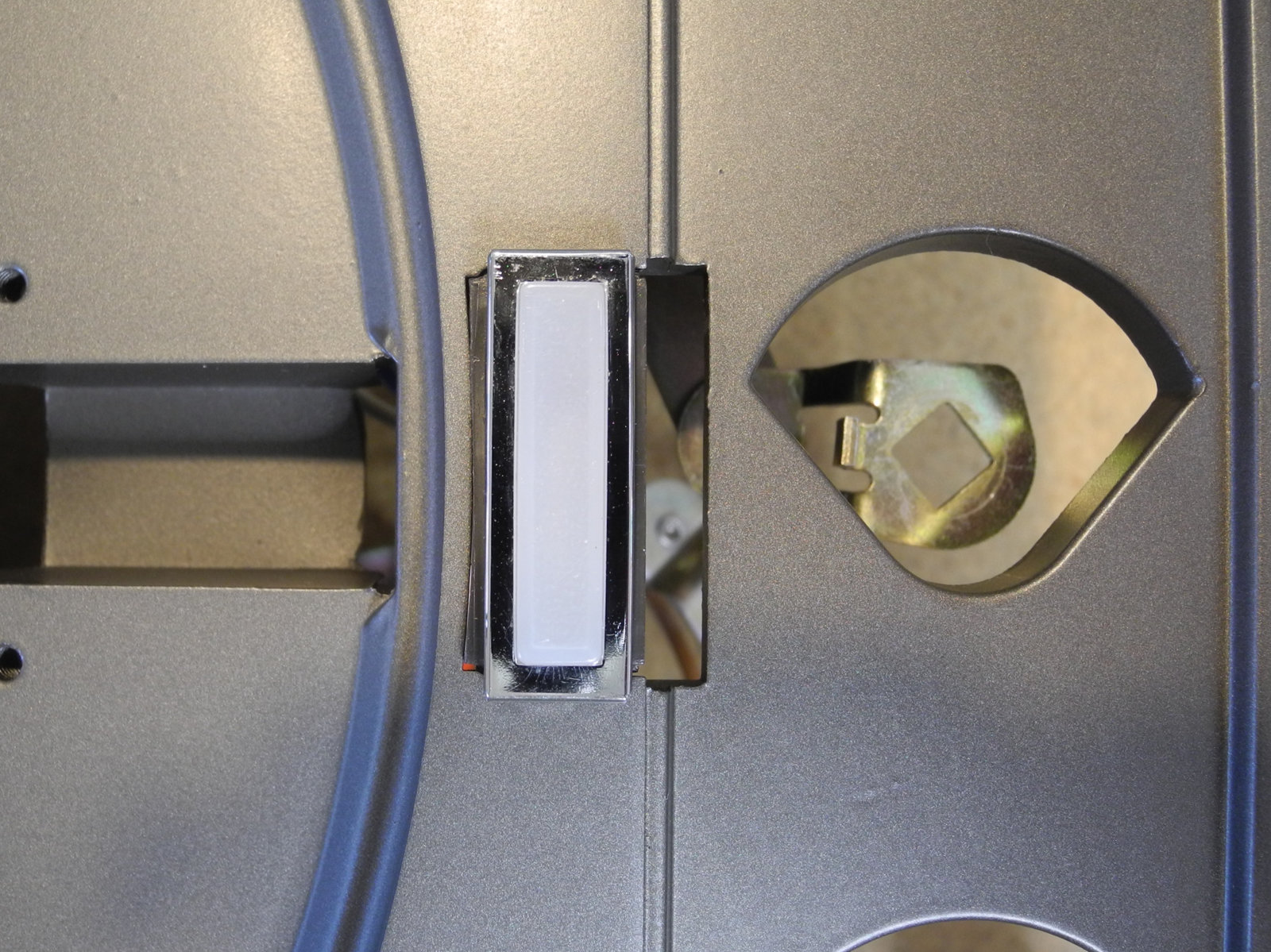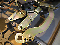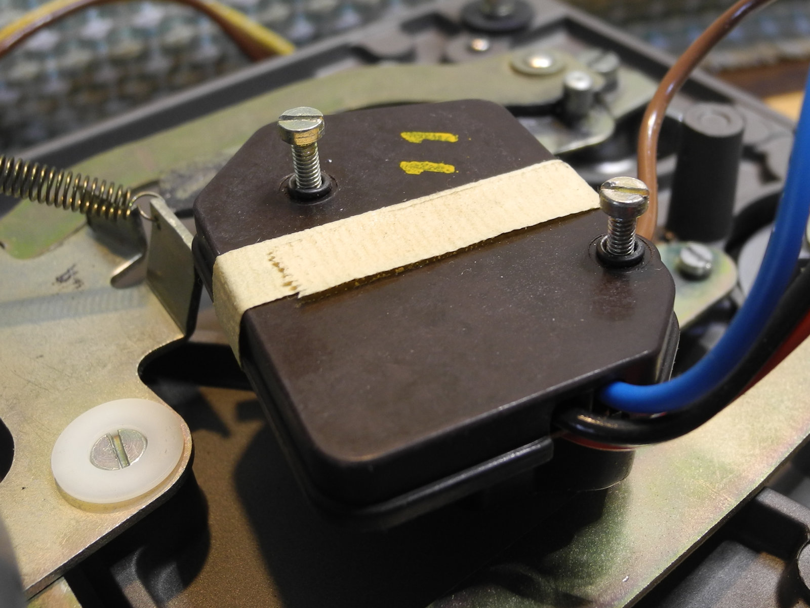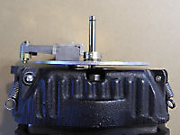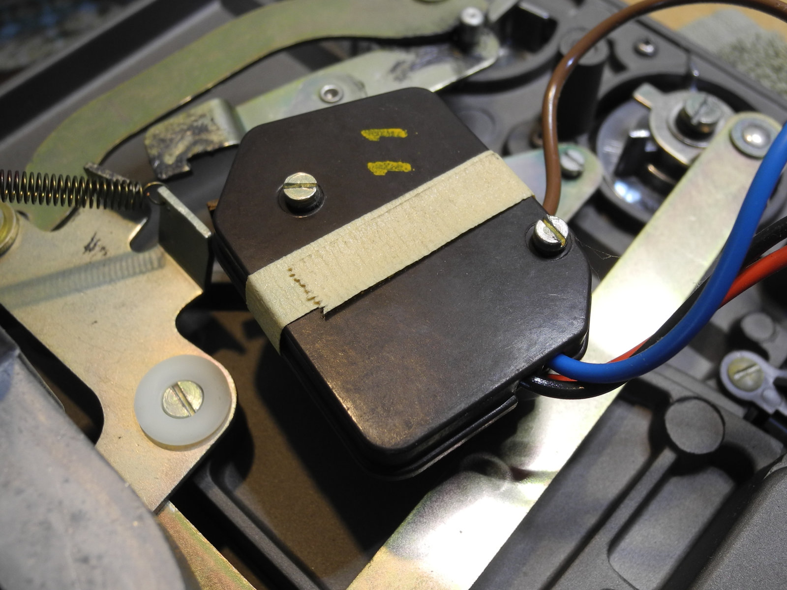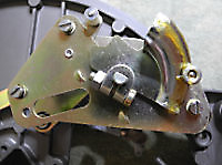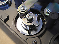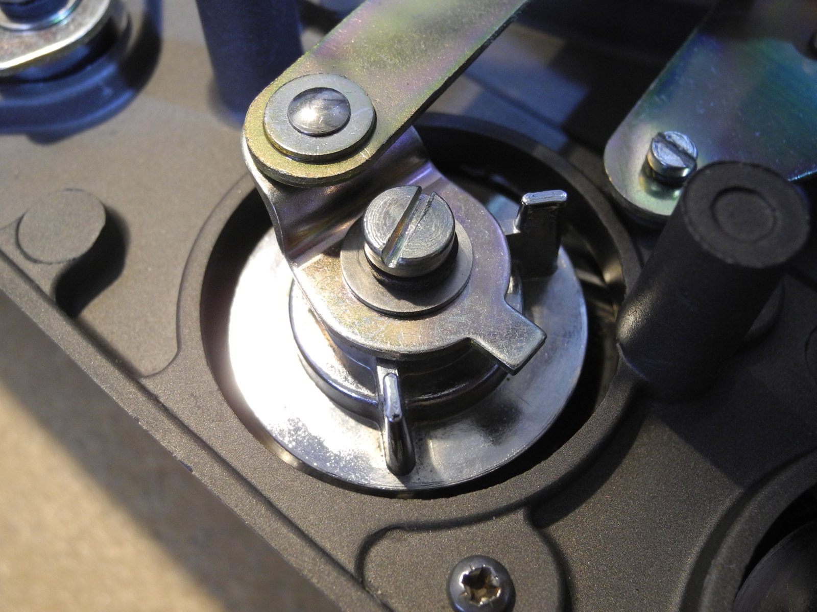 There are three systems of levers that connect the three front panel knobs to the speed change mechanism, the fine speed adjustment system (which uses a movable magnet to create eddy current drag in an aluminium disc), and the start/stop switching and interlocks.