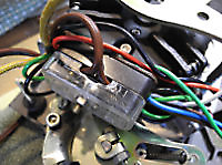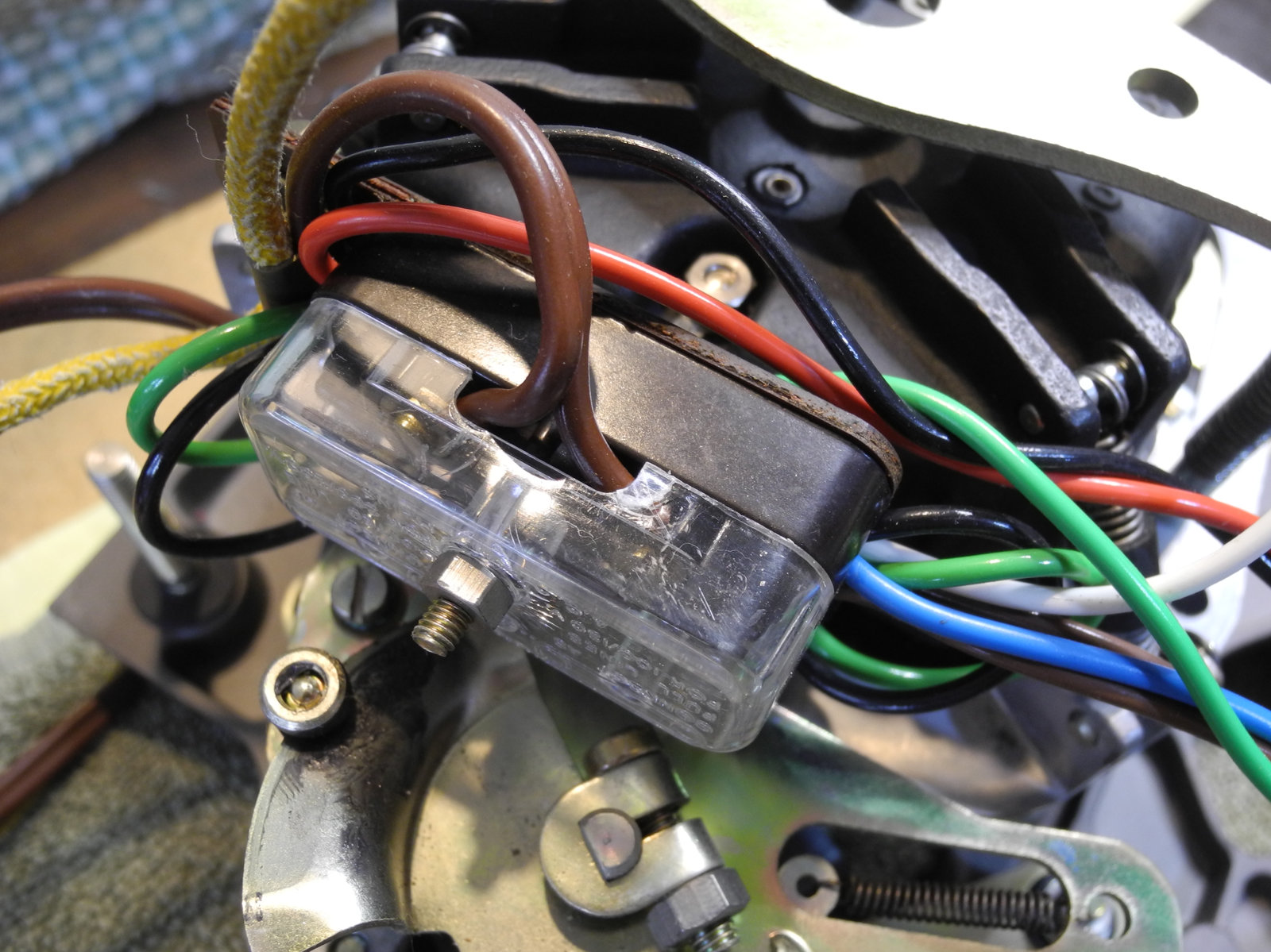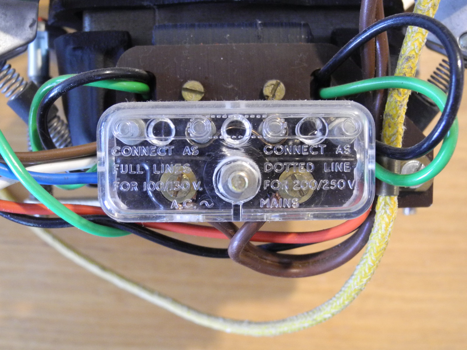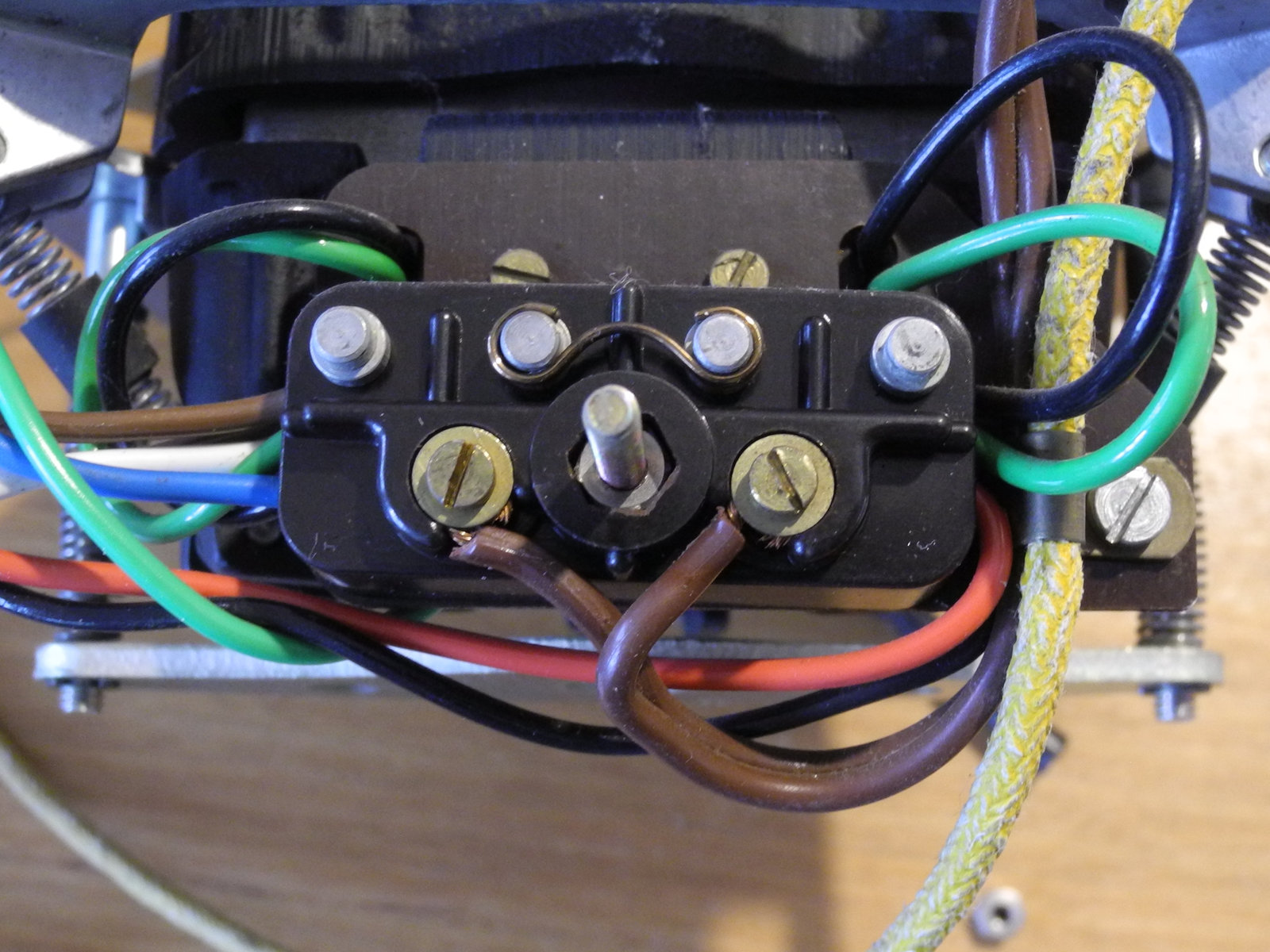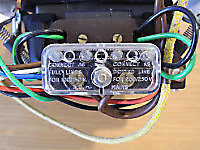 The Garrard 401 was originally supplied without a power cable. A connection point is provided by a terminal block mounted on the motor suspension frame. I had originally fitted some 2-core cable with a separate earth cable made from single-core cotton-covered cable and a 1960s era bakelite 3-pin plug. For this renovation, that old power cable was replaced by a white 3-core cable with moulded 3-pin plug which had been rescued from a discarded appliance.