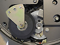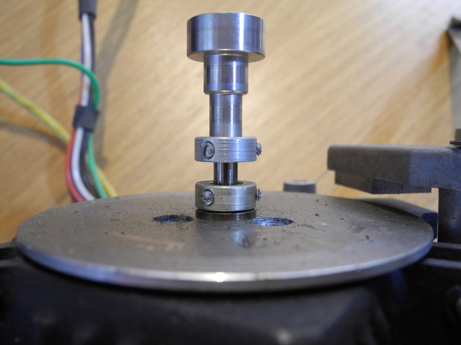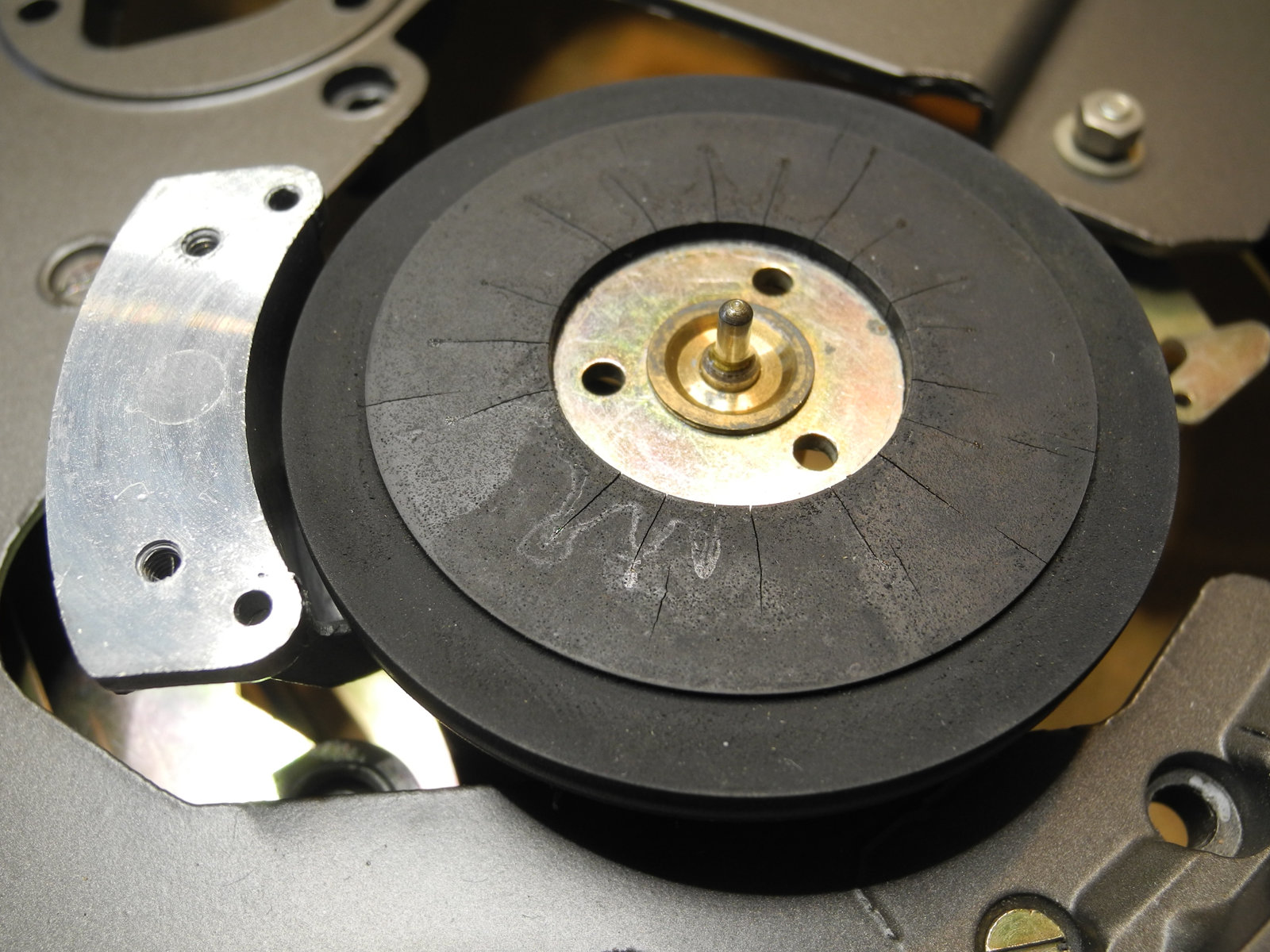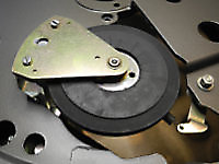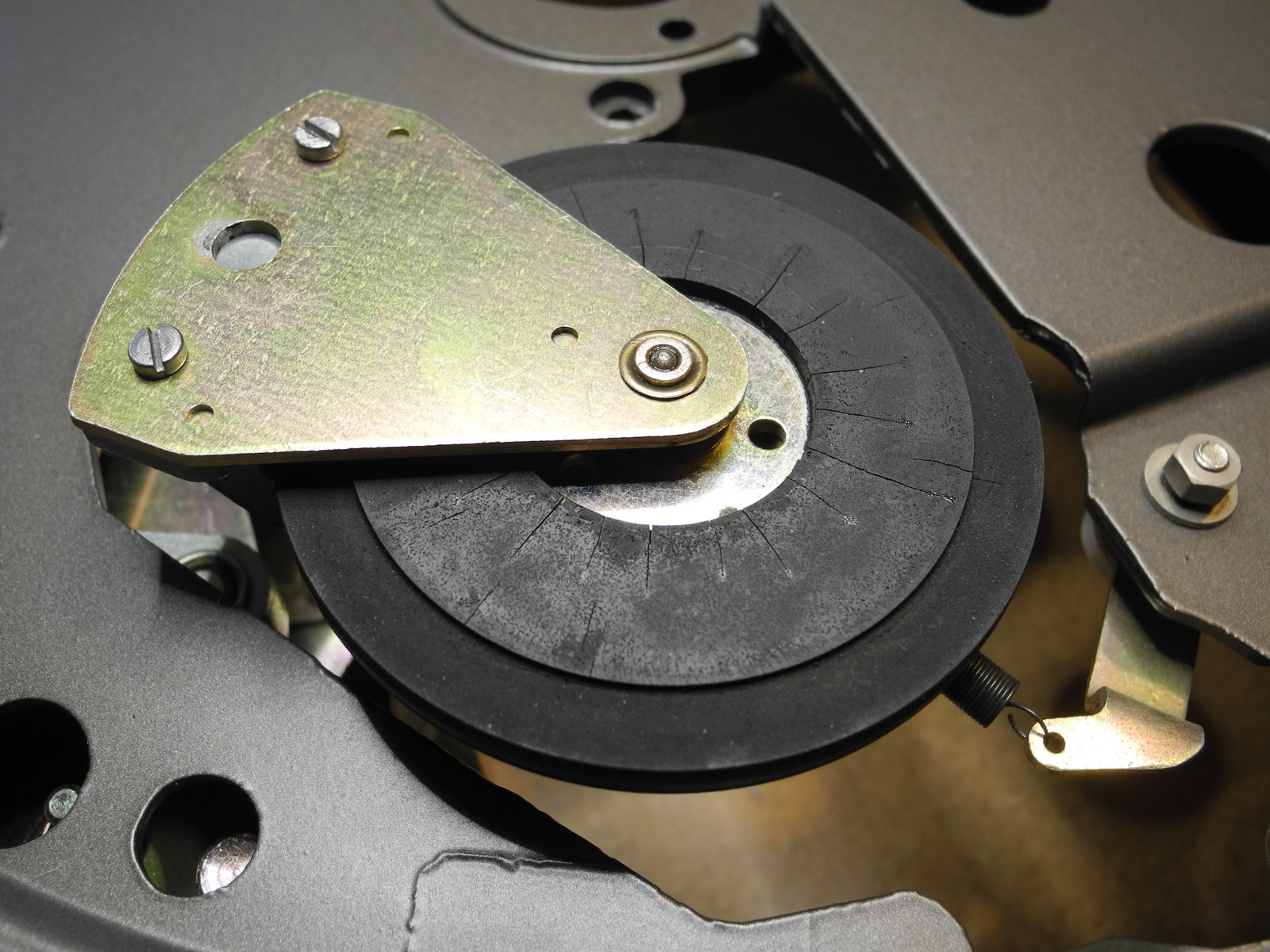 The photos below show that the rubber idler wheel has developed some radial cracks, which are probably due to ageing and hardening of the rubber. Replacing this original idler wheel with a new one would be an option. There is a supplier in the UK that makes new idler wheels for the Garrard 401.