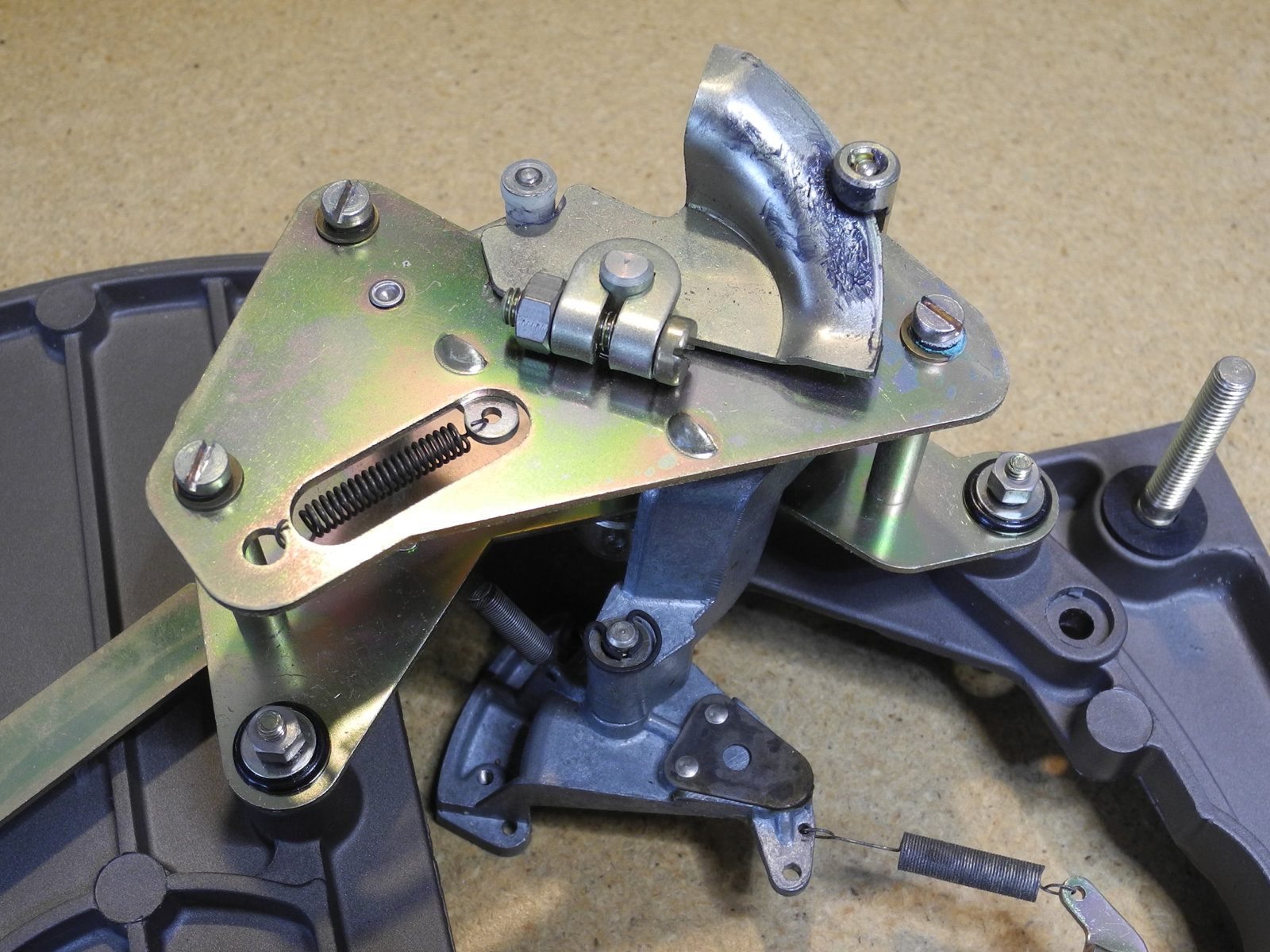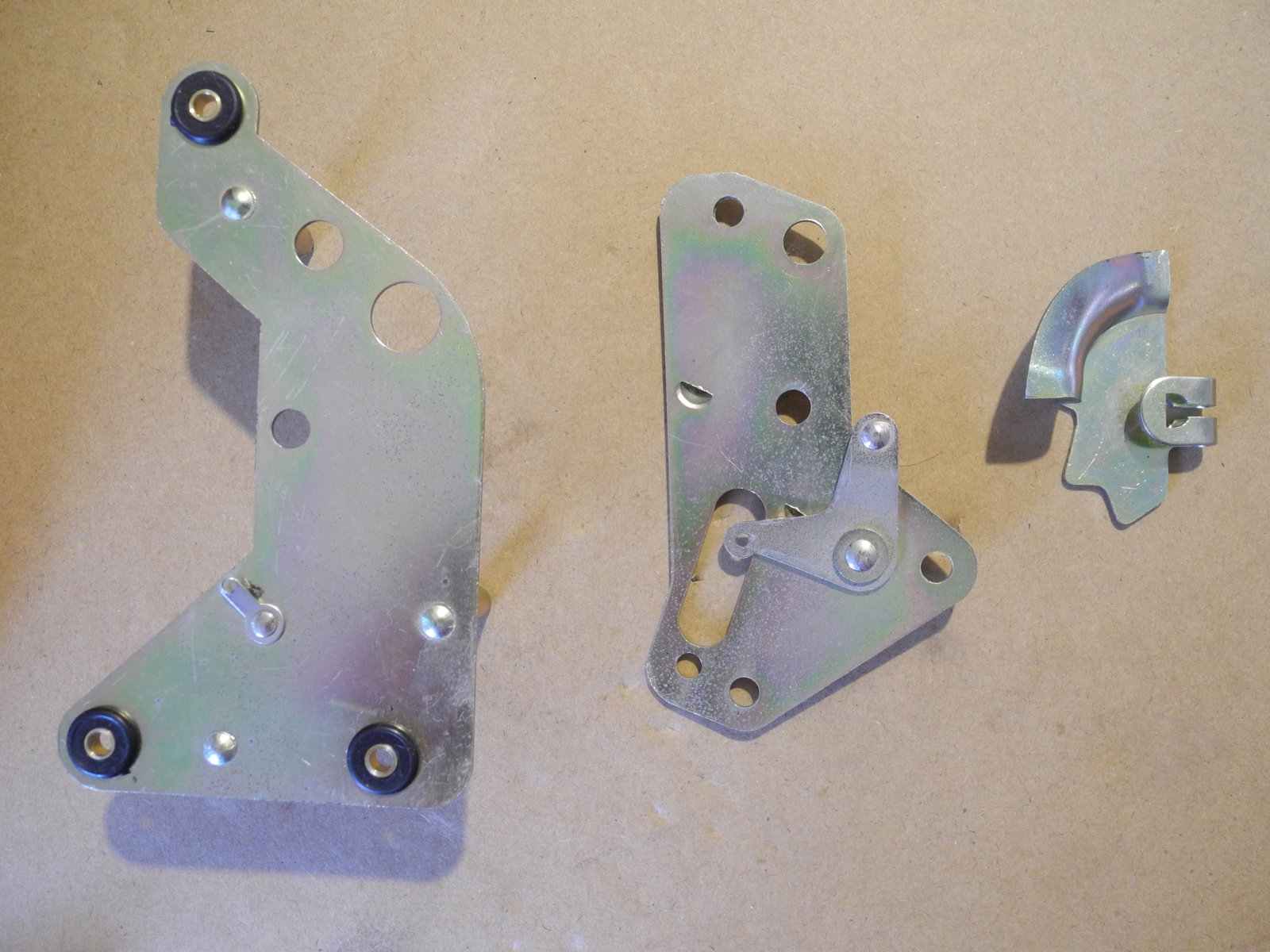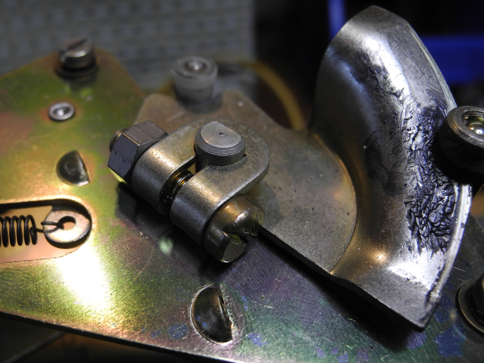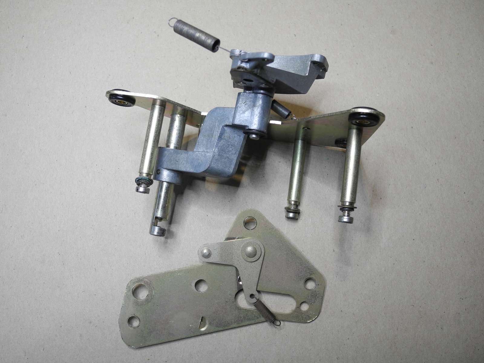These levers and other moving parts are made from thin steel plate (electroplated to suppress rust) cut and pressed into various custom shapes. The electroplating has a yellow colour, so is probably cadmium, which these days is considered toxic, so care was taken to wash hands well after handling these parts.