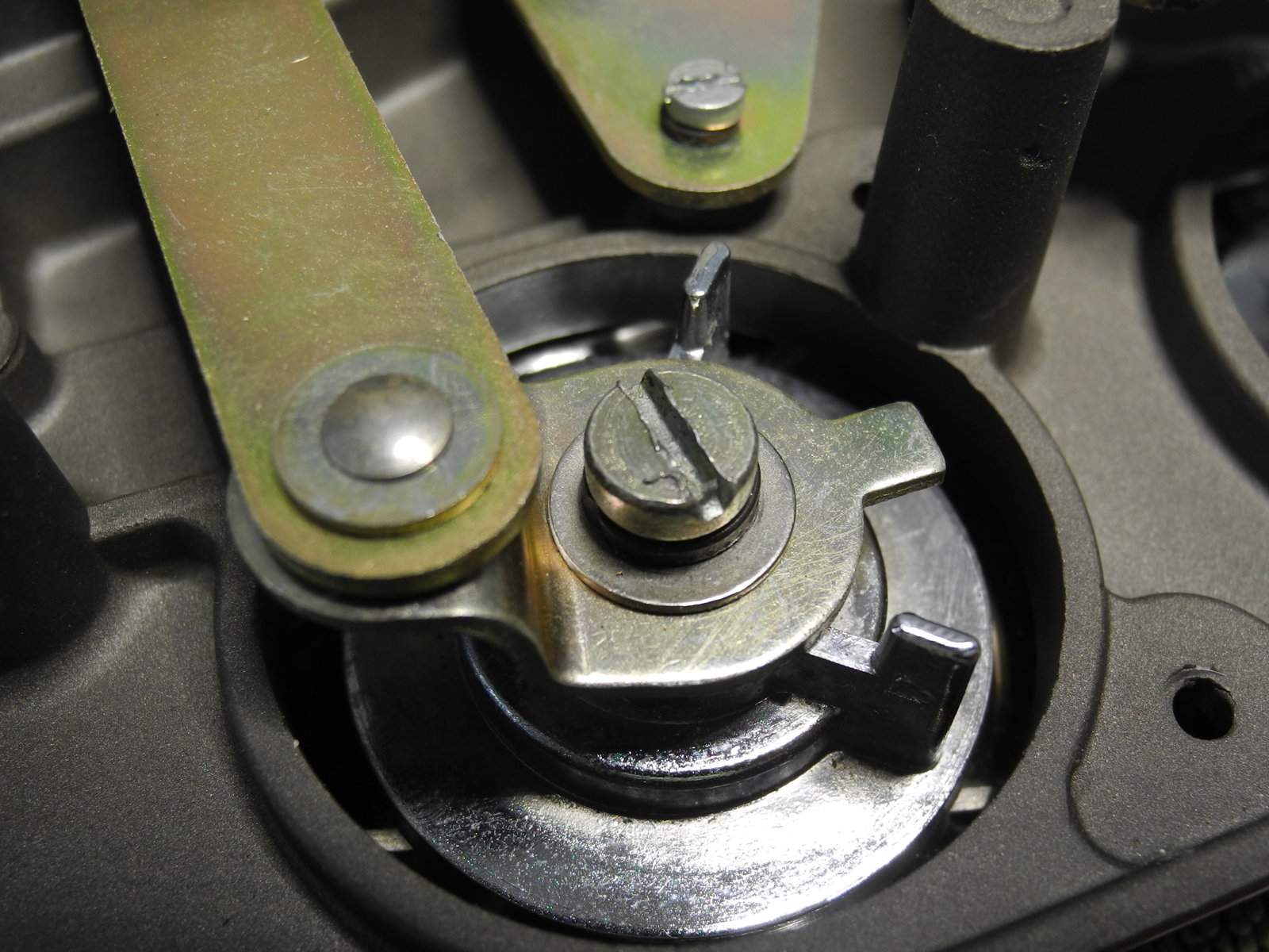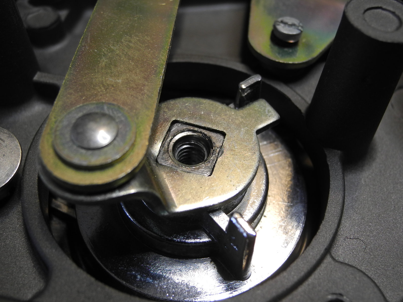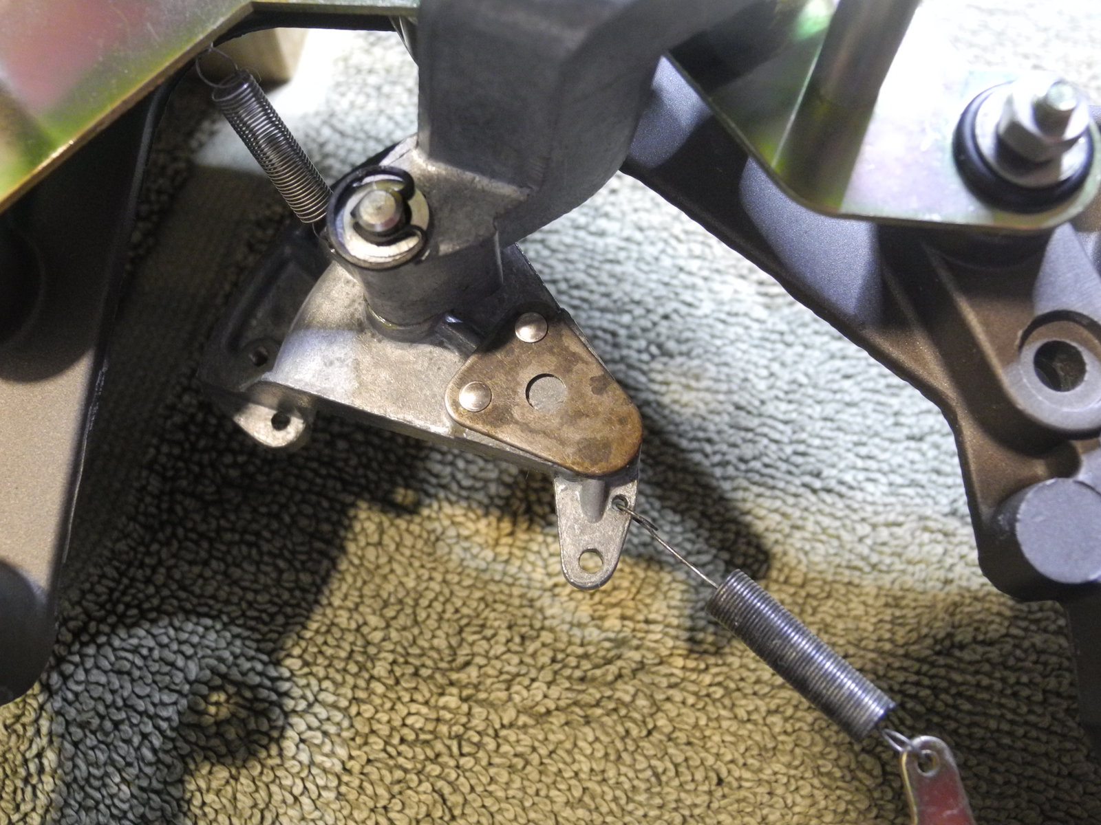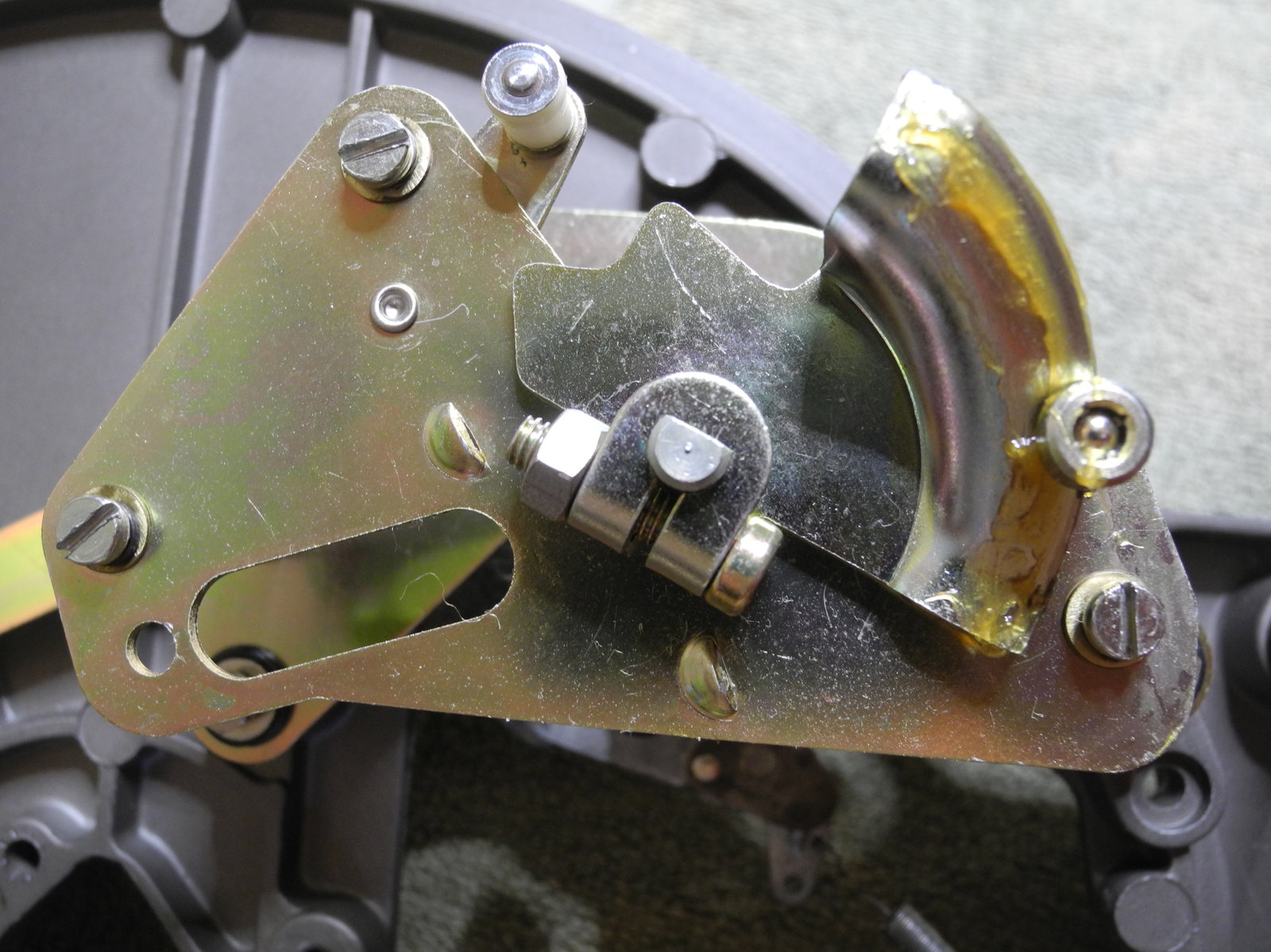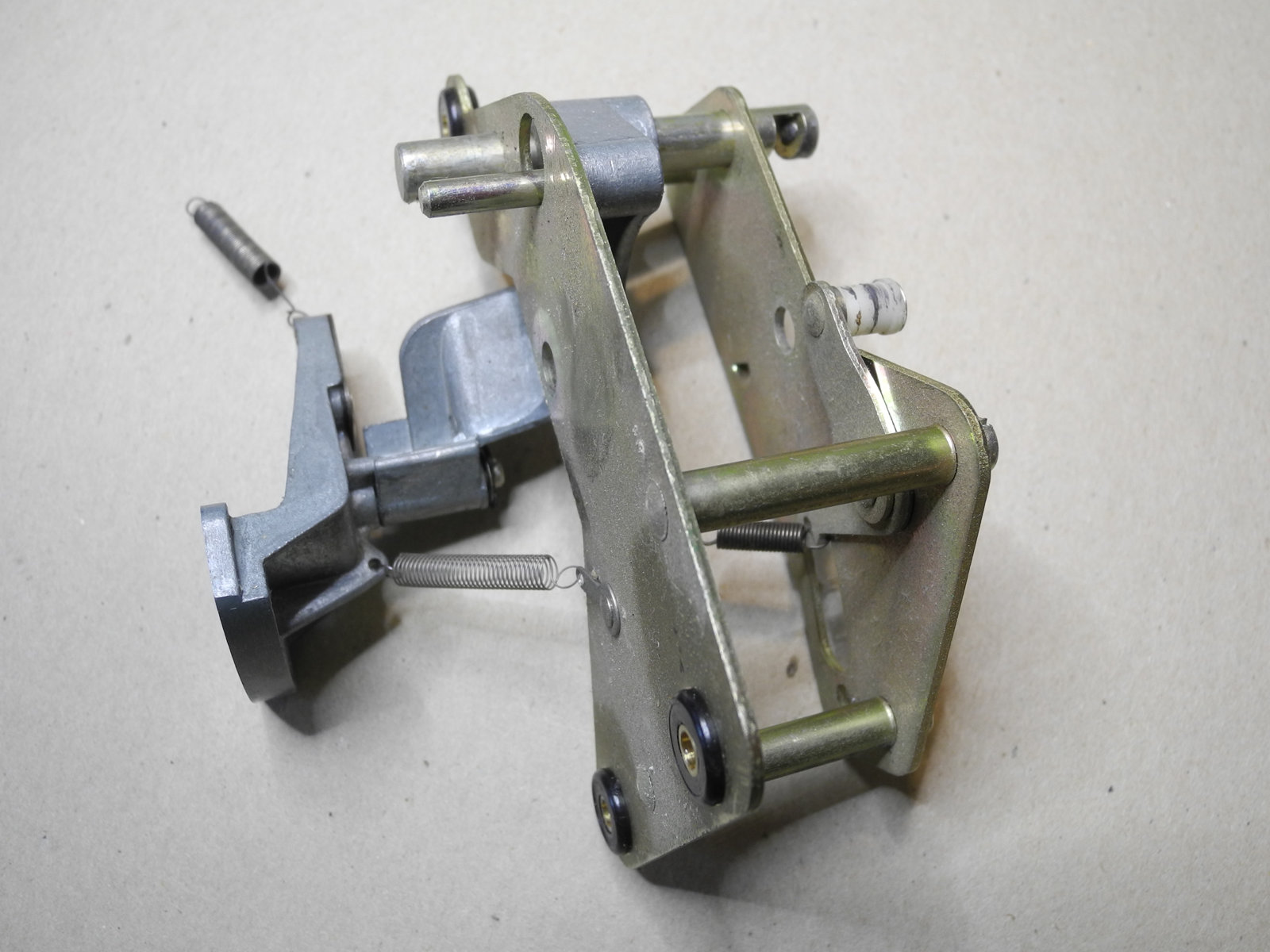 These levers and other moving parts are made from thin steel plate (electroplated to suppress rust) cut and pressed into various custom shapes. The electroplating has a yellow colour, so is probably cadmium, which these days is considered toxic, so care was taken to wash hands well after handling these parts.